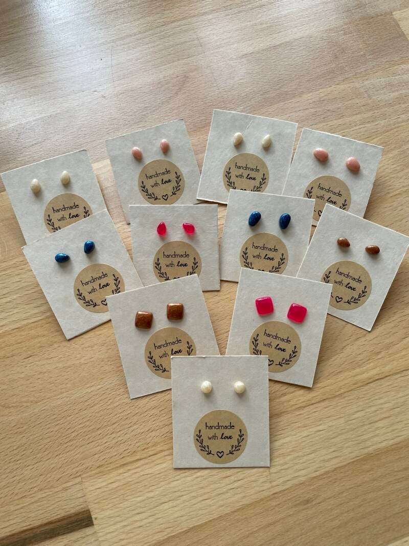 Handcrafted by Elle-Bees, small and medium stud earrings, made with resin on metal stud earring posts. There are two different sizes and a variety of shapes in a selection of different colours. The choice is yours. Excellent gifts, or great for day to day wear.