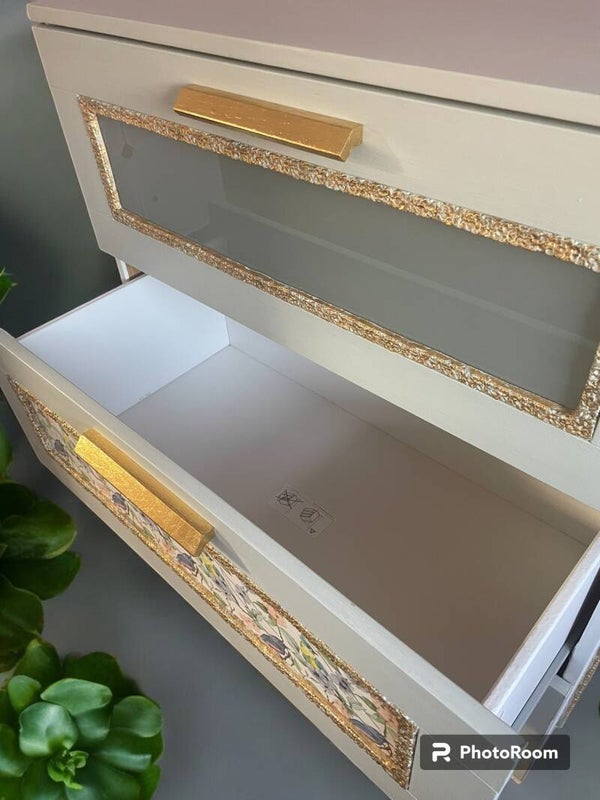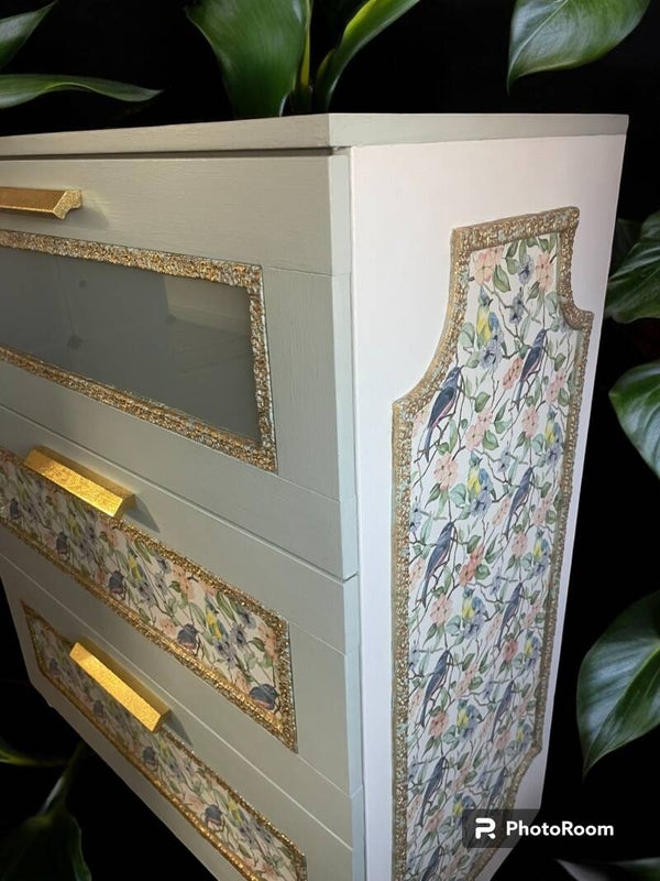 An elegant ‘Aged Vintage’ style three drawer chest. Upcycled to a high standard by hand in shades of green and white, with feature side panels of a beautiful natural design inset within gold leaf - clay molding. The chest has three drawers with the handles finished in gold leaf, one drawer has a glass front and the other two have the matching natural design, within gold leaf - clay molding, as the two side panels.