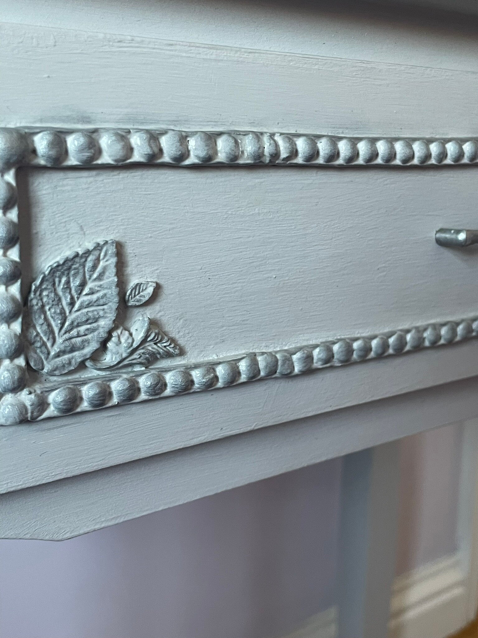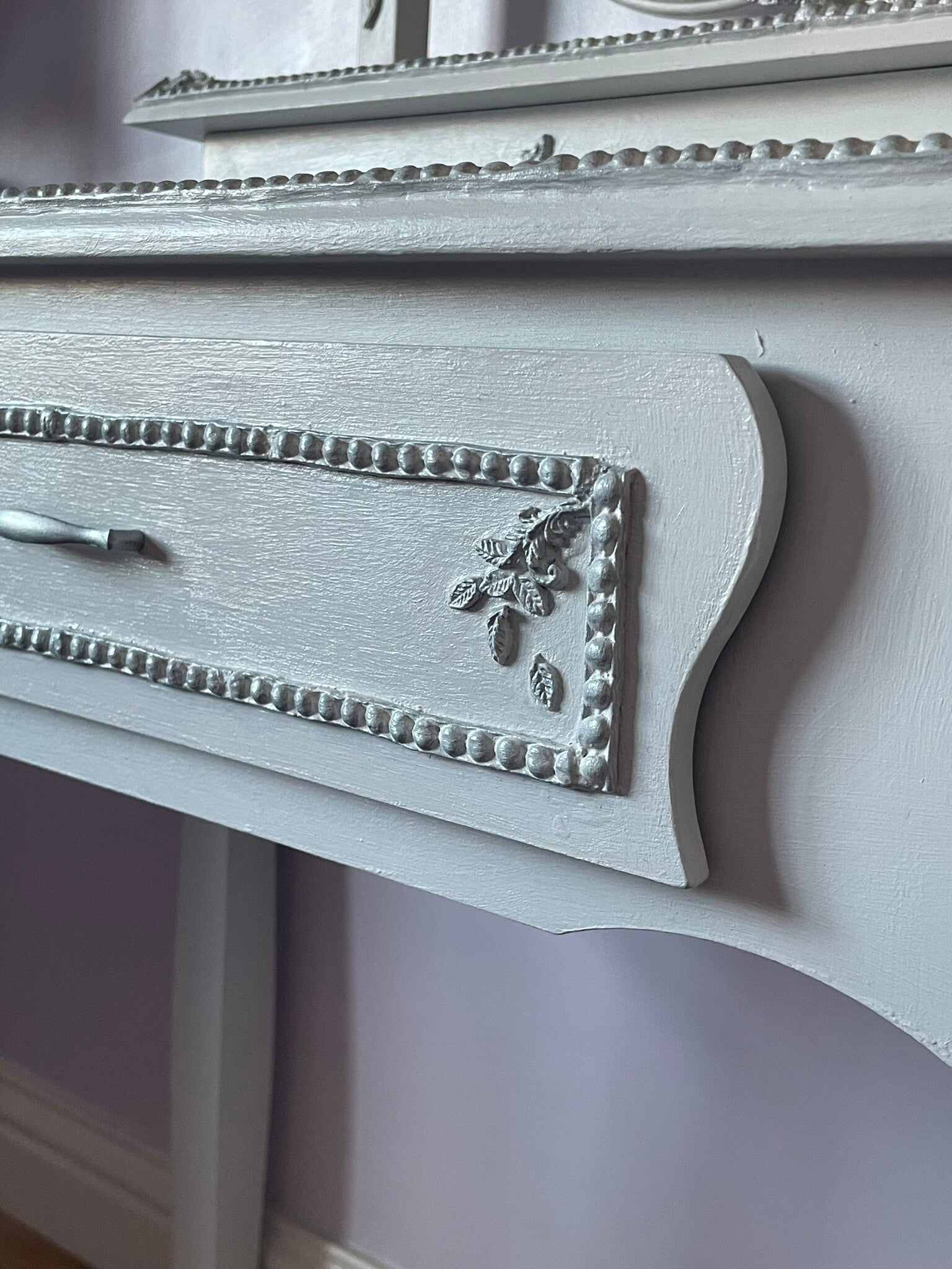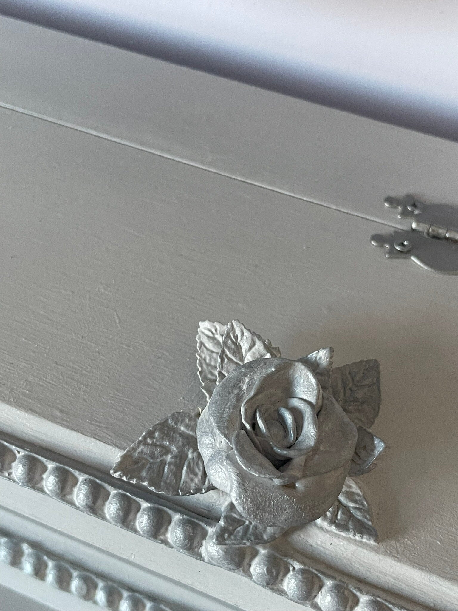 The surfaces of the dressing table (including not just the top visible surfaces, but also underneath and inside) including the mirror surround were first prepped and then primed. The clay mouldings and decorative flowers and foliage were then applied, prior to the whole piece receiving several coats of chalk furniture paint. Once dry the silver gilt was applied to highlight the tips of the delicate roses and leaves. Next, the hardware was cleaned, refurbished and brought back to life in keeping with the new look of the piece. The ‘Turtle Dove’ design was applied to the sides and inner drawer. Finally, the whole piece has been lacquered with several coats of Hemway lacquer in ‘satin’, to ensure the furniture is hardwearing and durable for many years to come. To clean your furniture, dust with a dry cloth.