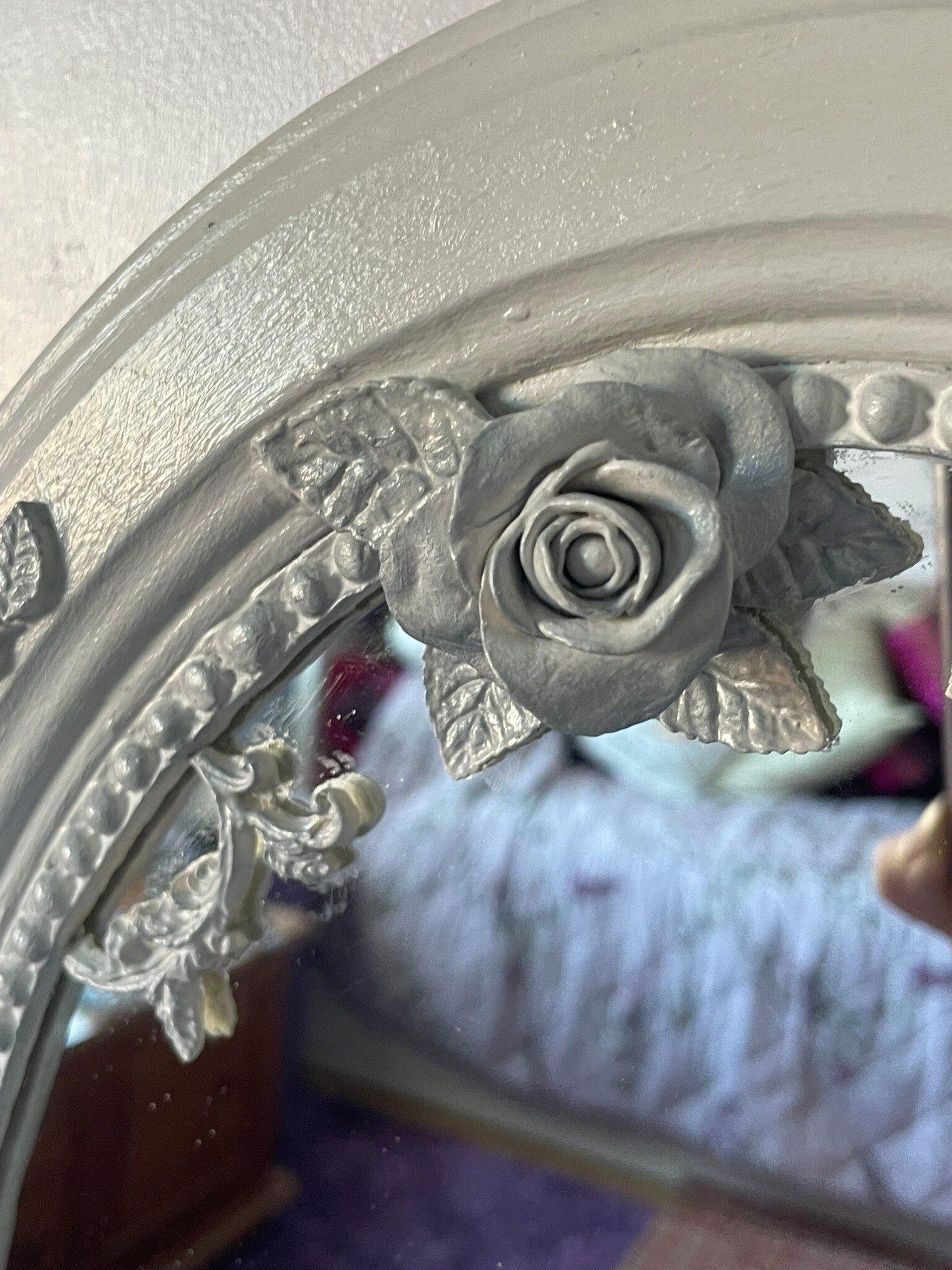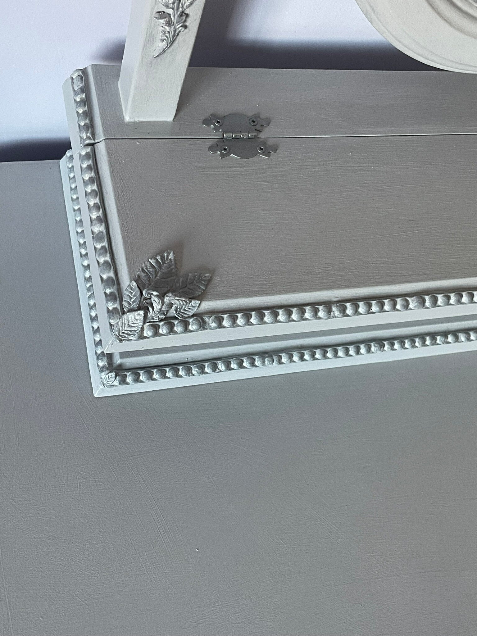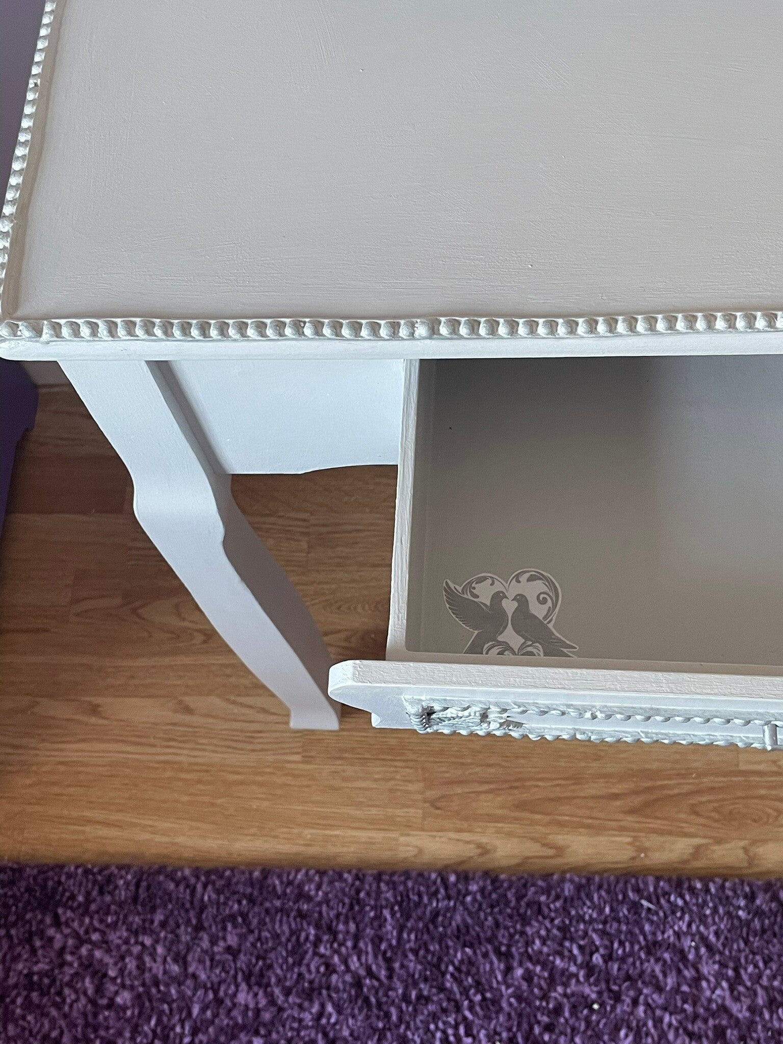 The surfaces of the dressing table (including not just the top visible surfaces, but also underneath and inside) including the mirror surround were first prepped and then primed. The clay mouldings and decorative flowers and foliage were then applied, prior to the whole piece receiving several coats of chalk furniture paint. Once dry the silver gilt was applied to highlight the tips of the delicate roses and leaves. Next, the hardware was cleaned, refurbished and brought back to life in keeping with the new look of the piece. The ‘Turtle Dove’ design was applied to the sides and inner drawer. Finally, the whole piece has been lacquered with several coats of Hemway lacquer in ‘satin’, to ensure the furniture is hardwearing and durable for many years to come. To clean your furniture, dust with a dry cloth.
