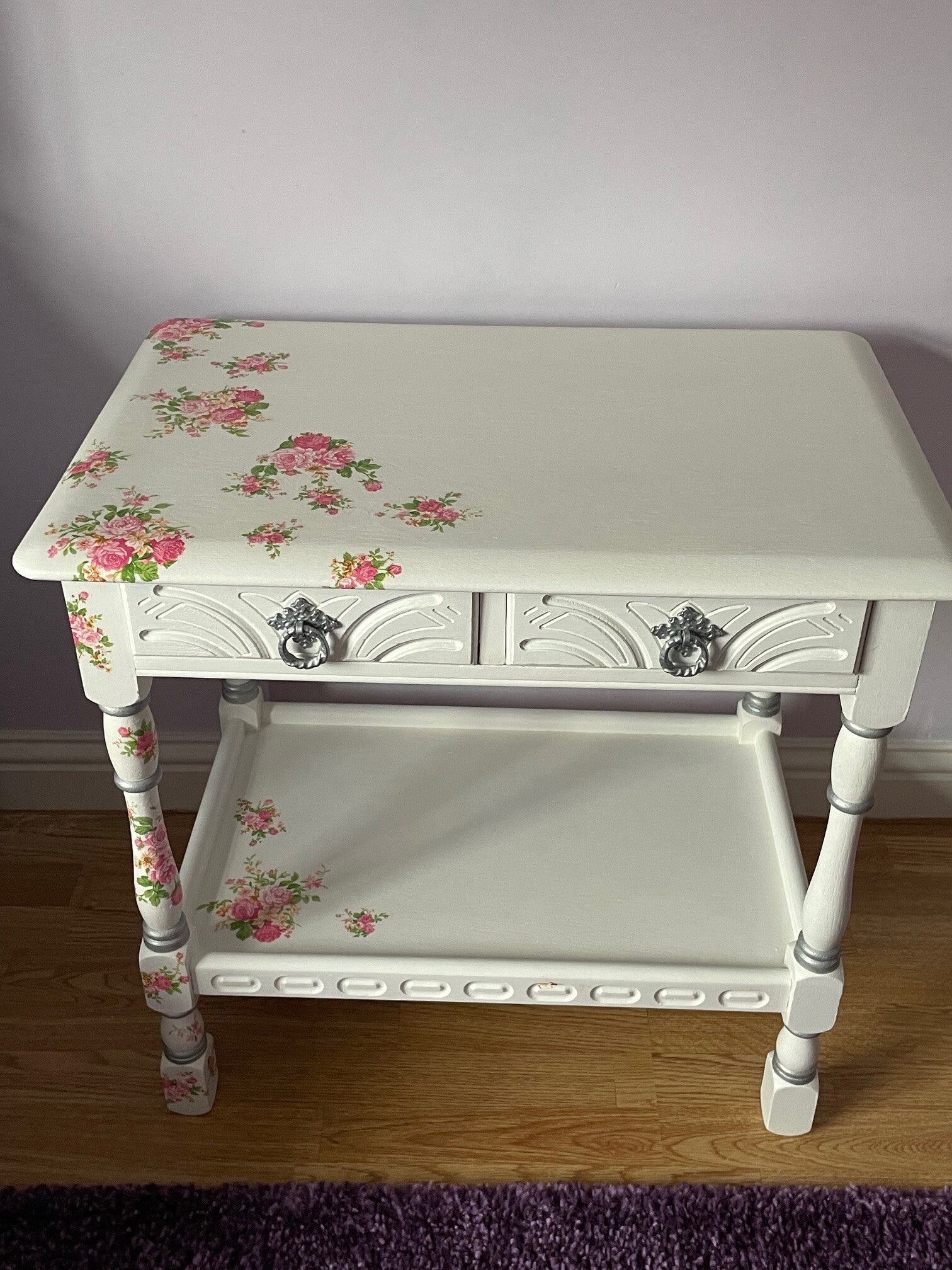 A beautiful refurbished 'Priory' antique side/end table which I ahave named ‘The Roses’. She is a stylish and elegant table, a one-off, bespoke piece of furniture that has two small storage drawers, complete with original handles and a feature lower shelf area.