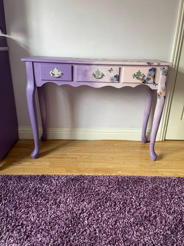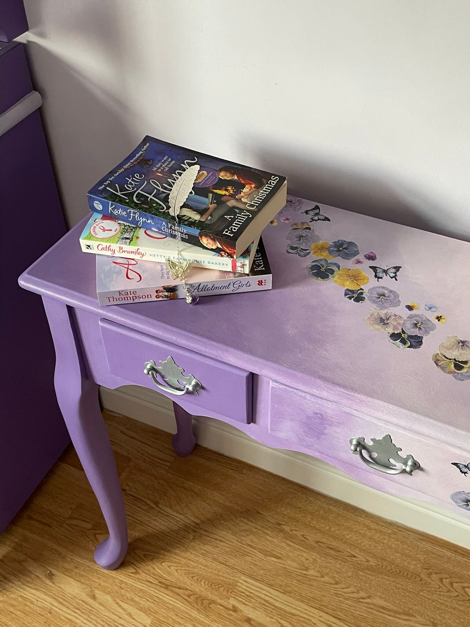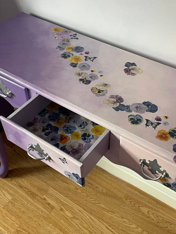 Upcycled to a high standard using a blend of chalk paints and decorated with pansies and butterflies, using a technique called decoupage. Lilac was finished with several coats of hardwearing lacquer (by Hemway) so she will be fit for purpose for many years to come. She is delicate, pretty and unusual, if you are looking for a unique, yet functional piece of furniture for you home, you definitely will not find another table like Lilac.