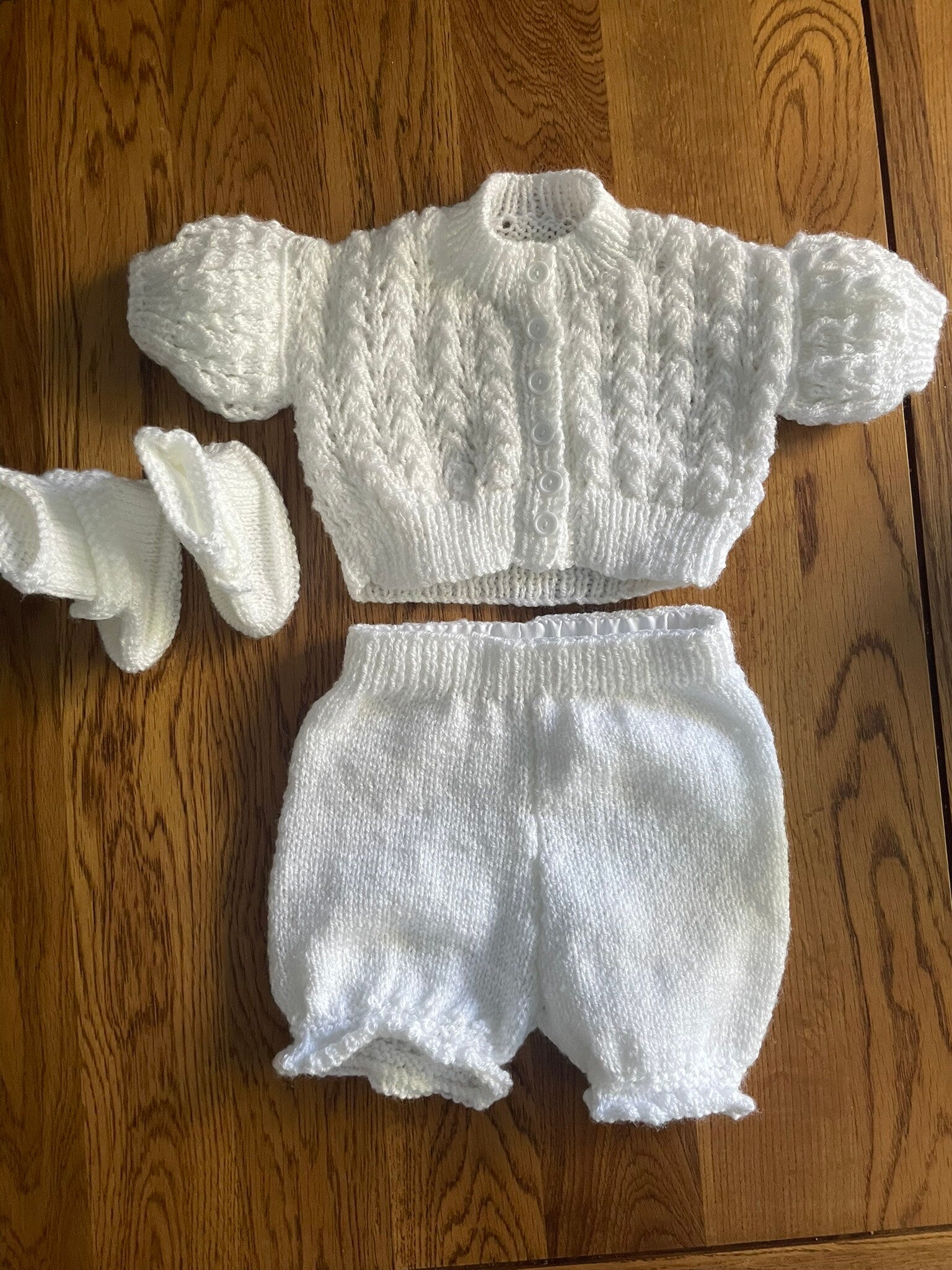 Handknitted - Baby cardigan, shorts and booties set