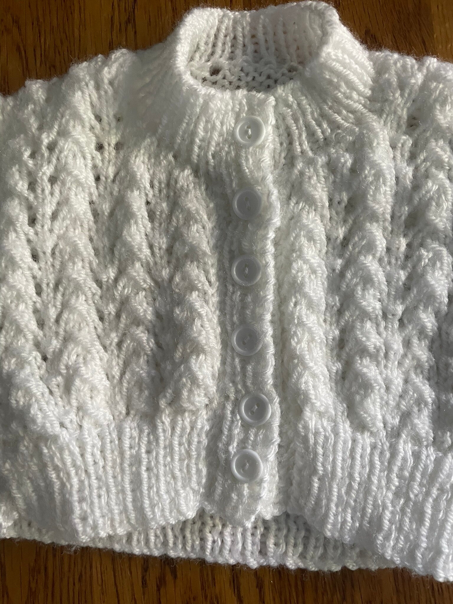 The cardigan features a patterned design with a round neckline and button closure. This little set is versatile and could easily be worn as a christening outfit or, alternatively, it is equally suitable for a casual occasion.