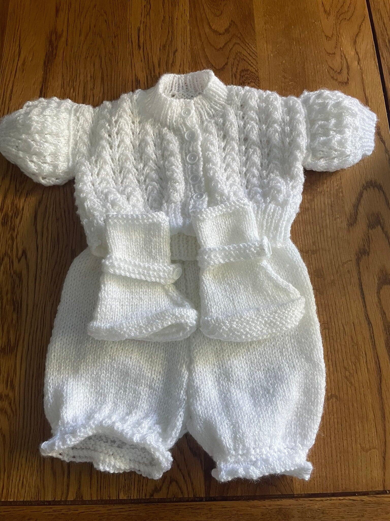 Made from an acrylic blend wool in classic white, this set is hand-knitted and ideal for autumn, summer, and spring seasons. With the unisex design it would make a great option to add to any new baby's wardrobe.
