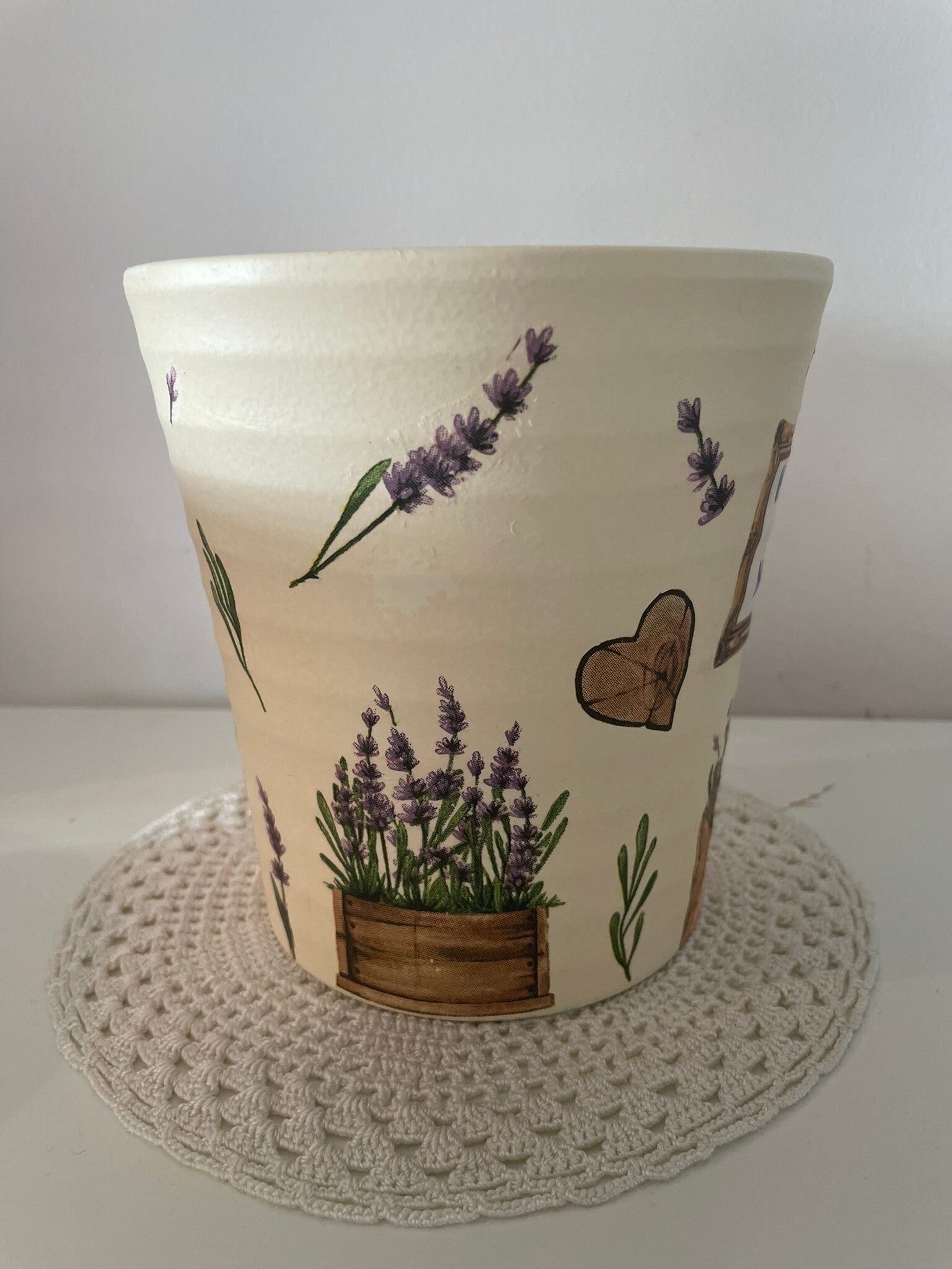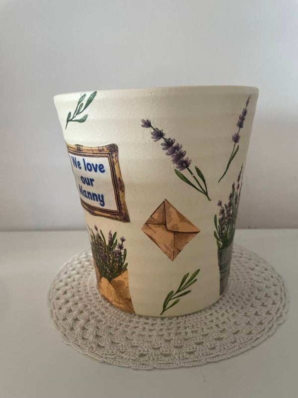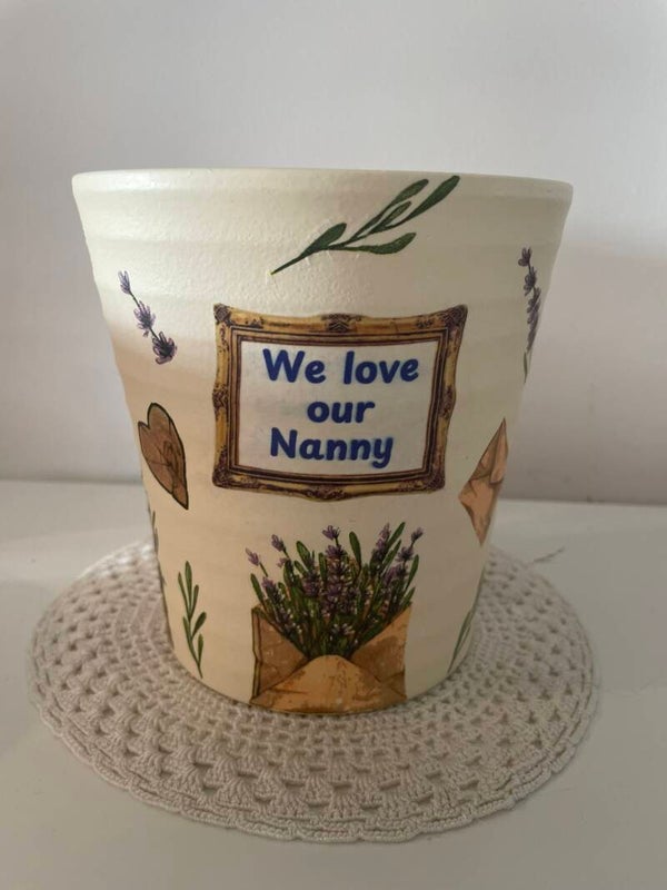 Gift wrapped planter with lavendar and 'We Love Our Nanny' quote on the front.
