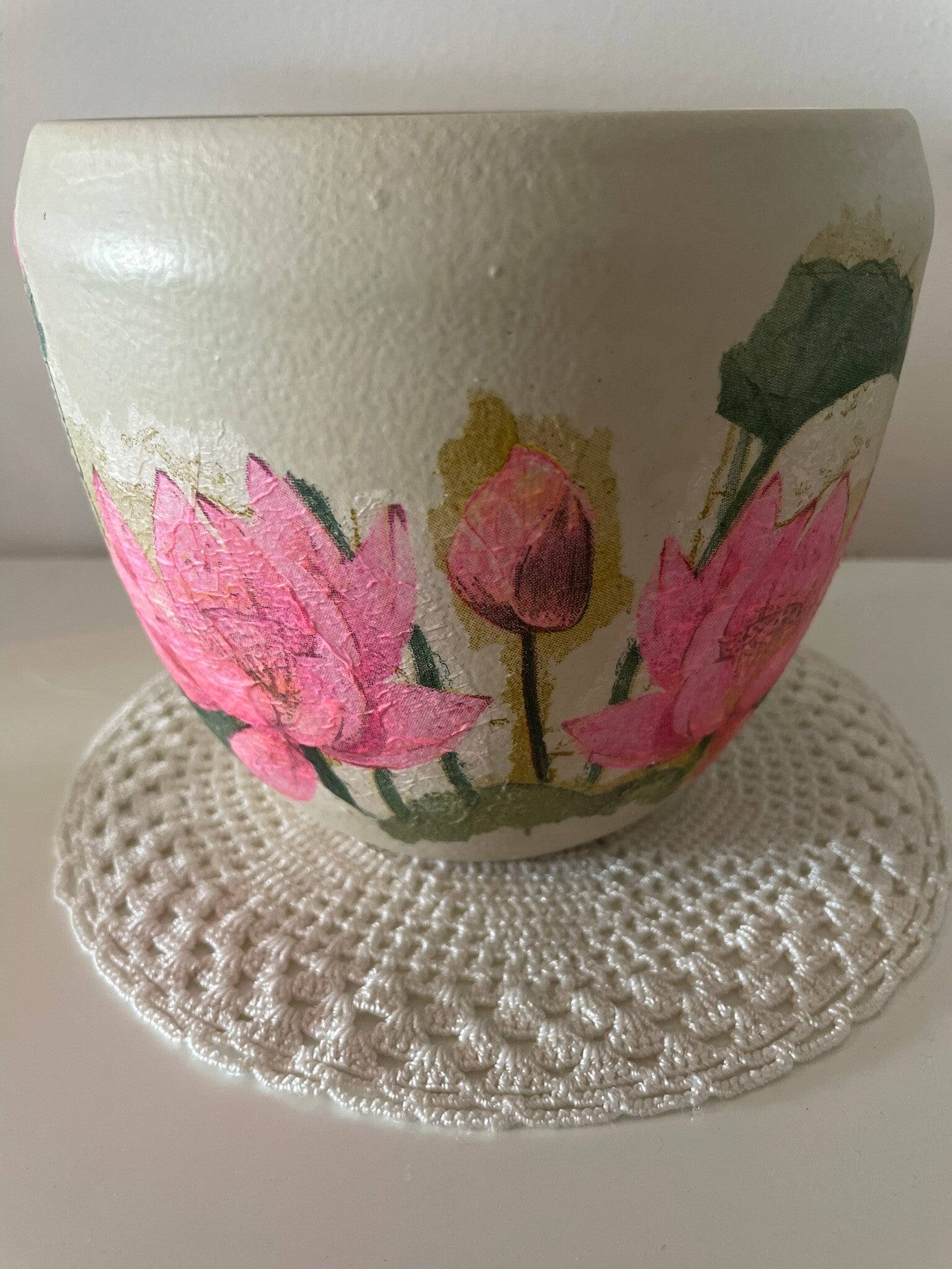 Cream ceramic plant pot with pink flower design.