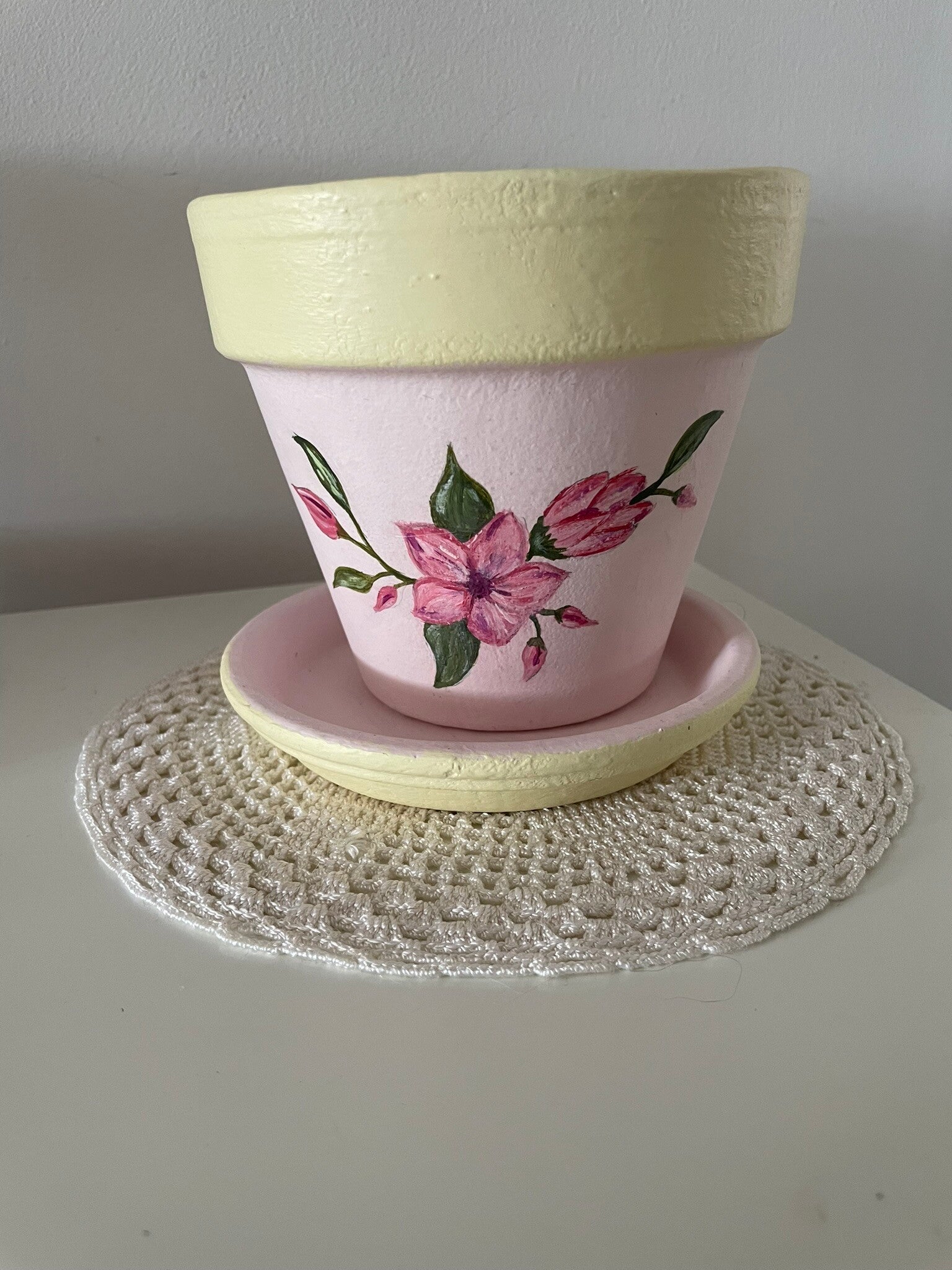 A pink and lemon hand-painted, decorated planter for indoors or outdoor. Complete with matching saucer.