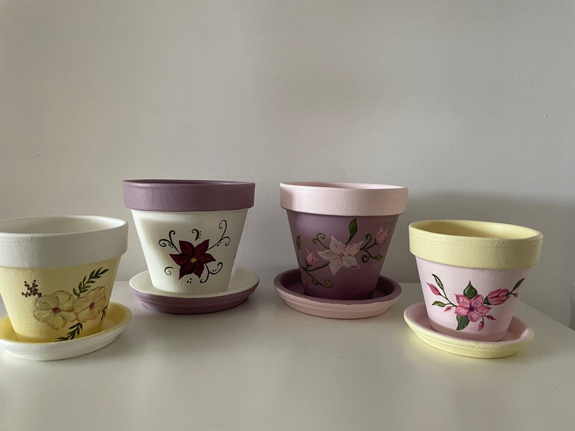 A small size, white and lemon hand-painted, decorated planter for indoors or outdoor. Complete with matching saucer.