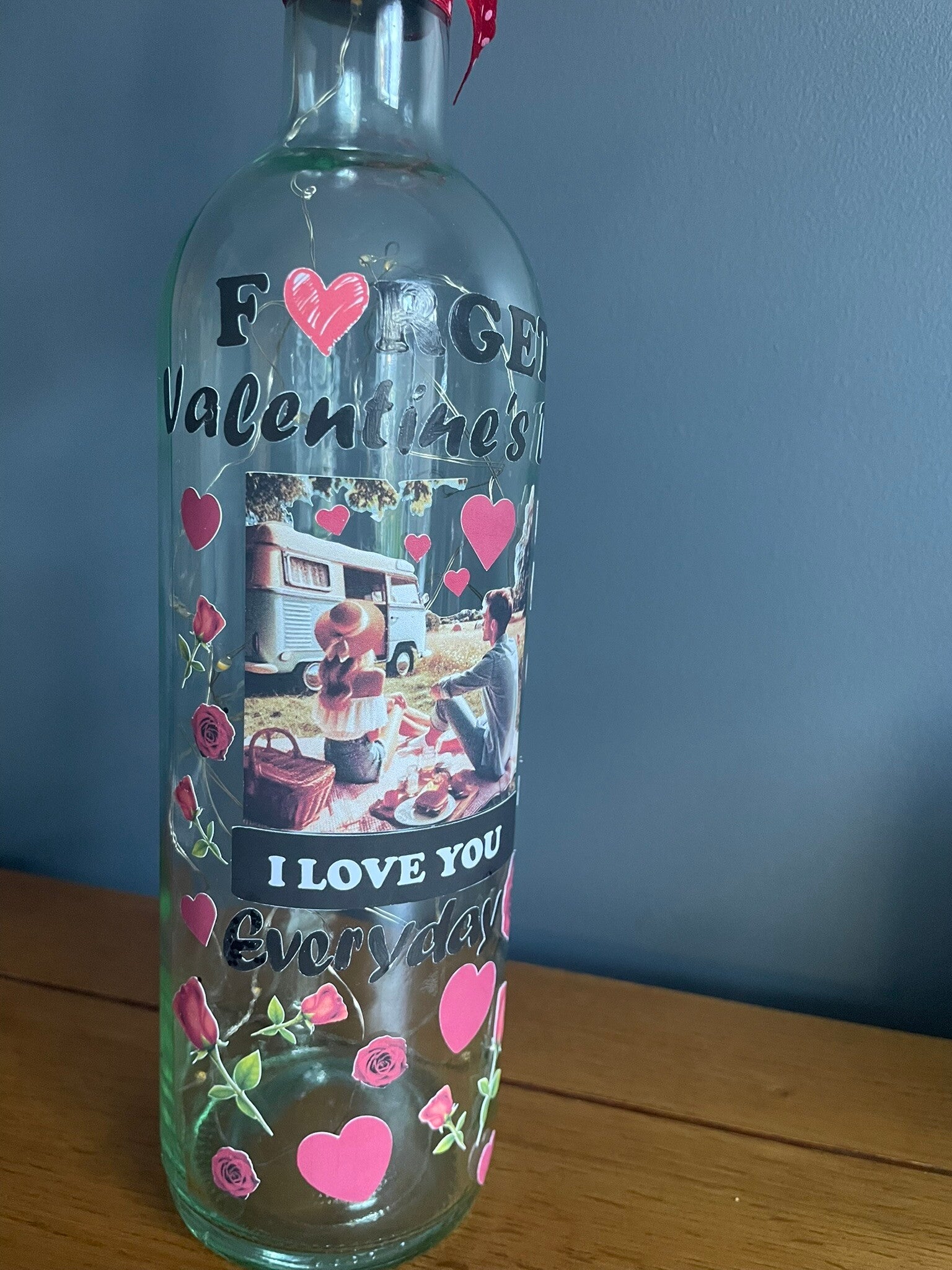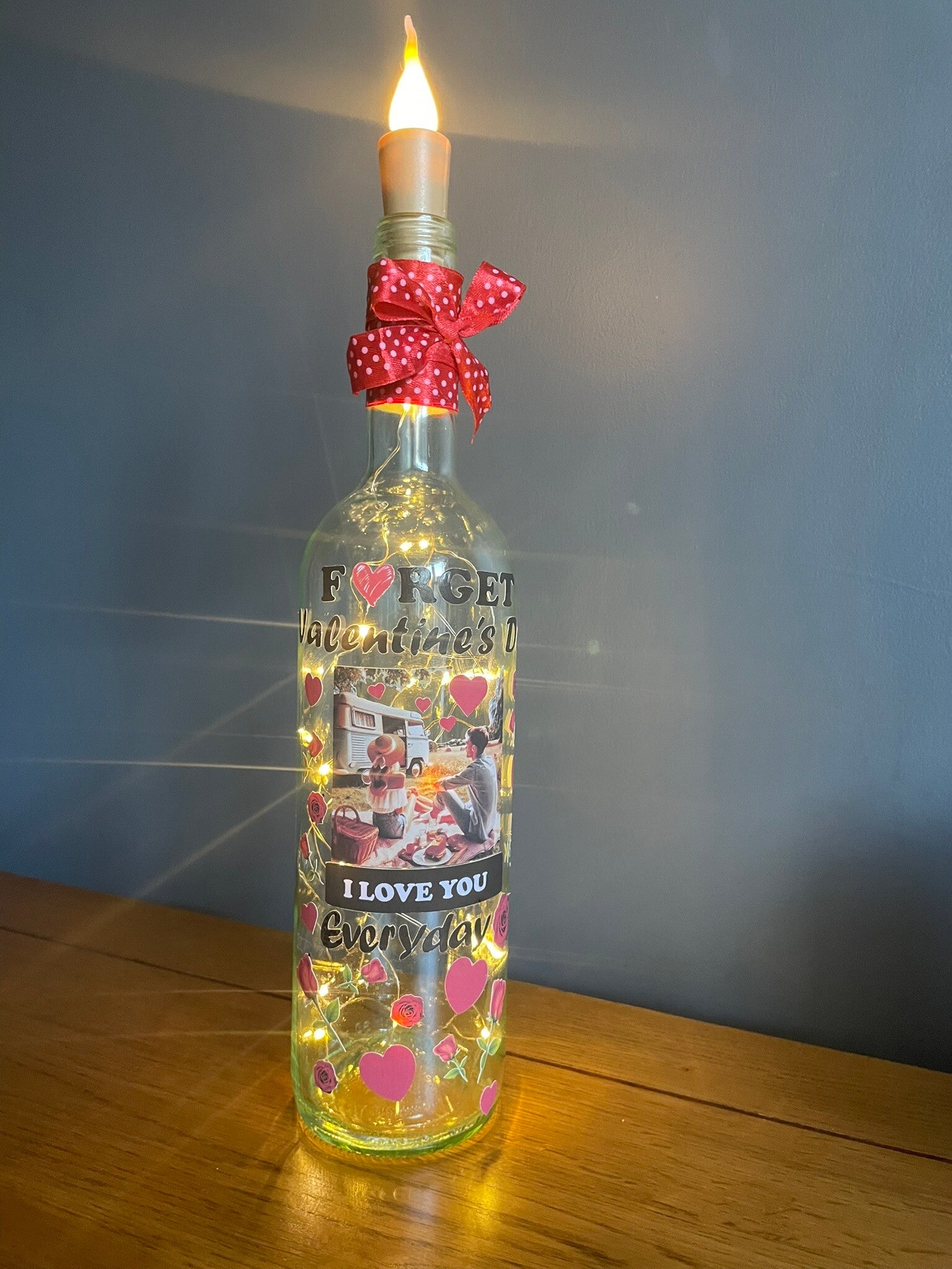 This is Lamp 2 - Couple on a picnic blanket/camper van - words: 'Forget Valentine's Day. I Love You everyday.' LED lights powered by three button cell batteries. Switch on and off as desired.