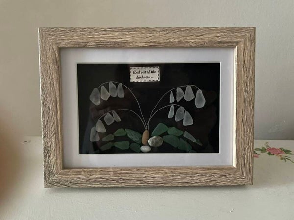 A handmade Sea-glass picture. Sea-glass collected from around the Kentish Coast. The Design is the flower of life - The sentiment 'And out of the darkness... ' represents 'hope'.