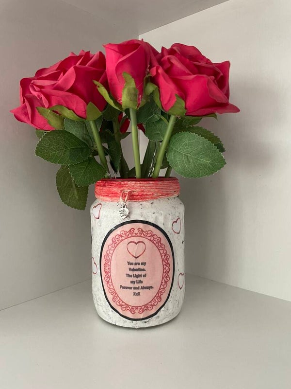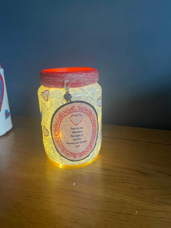 A lovely little sentiment for Valentine's Day. Suprise your loved one with a light up Valentine Desk Jar. Could also be used as a vase for those valentine red roses.
